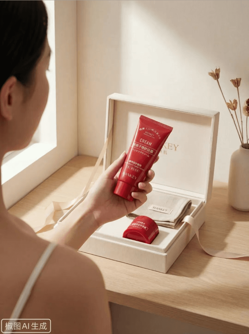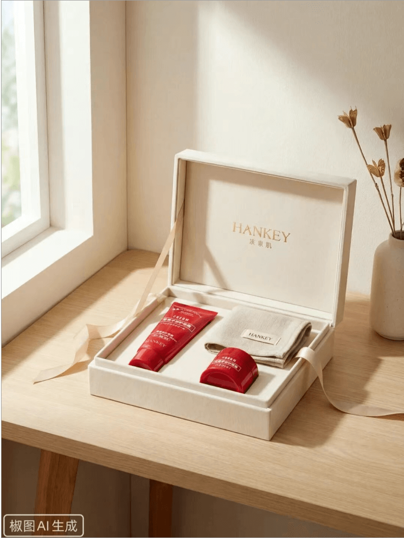 提示词:基于产品的实拍照片,生成产品的礼盒场景图。在真实室内桌面环境中拍摄,自然光照亮礼盒与产品,画面明亮干净,桌面留有自然阴影与空间层次。整体构图有明确主次与留白,画面像经过品牌设计而非随意摆放,呈现高端护肤品礼盒场景的真实摄影质感。