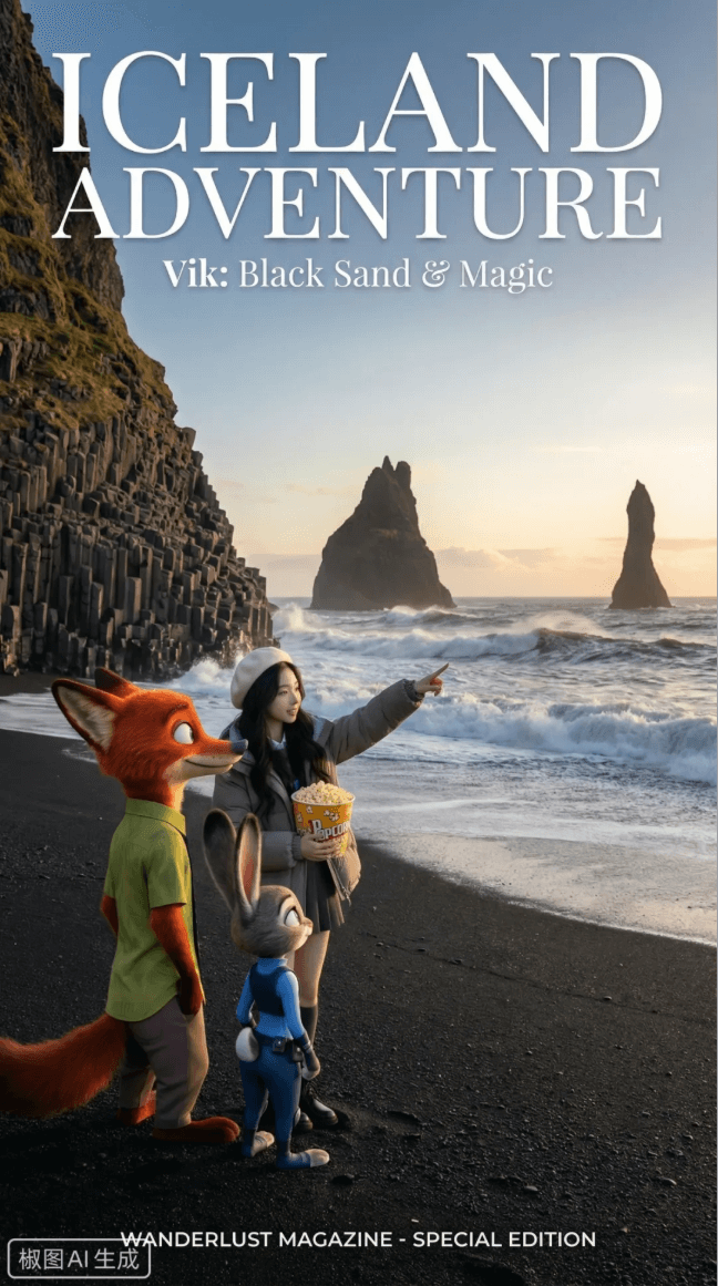 提示词:将参考图中的角色自然融入一个场景,呈现他们在经纬度为【63.615623,-19.988685】的地点进行观光的画面。画面整体以精美杂志封面风格进行布局,构图考究、层次清晰。作为一本高品质杂志或旅行相册的封面设计,重点突出人物与场景的融合感。请将这一页当作非常重要的展示页面来设计,让观众一眼就产生兴趣,愿意继续了解这个地点。