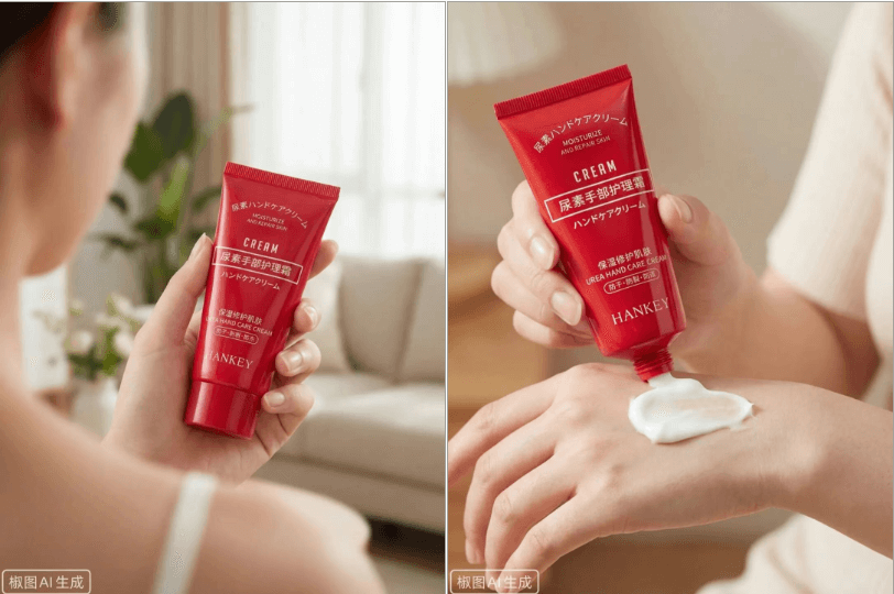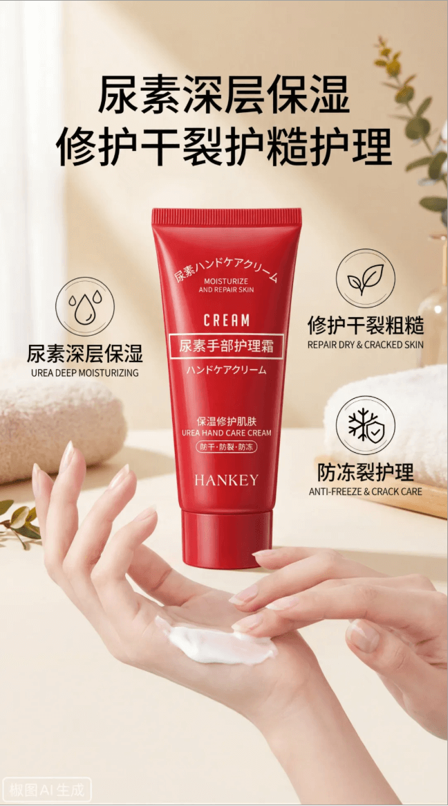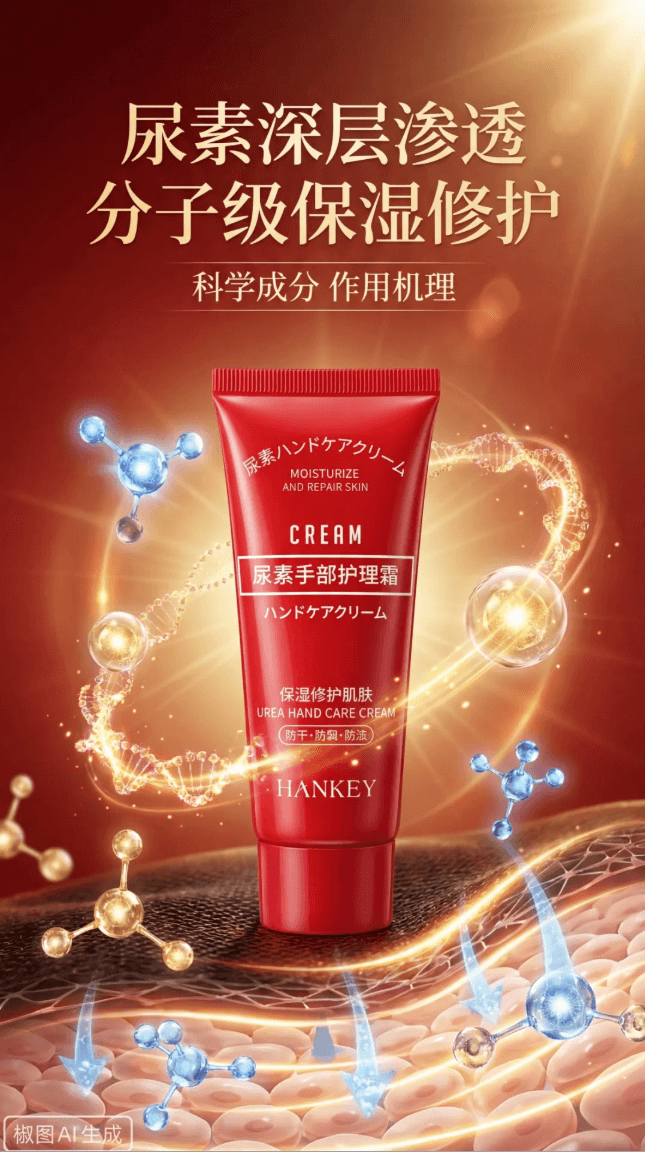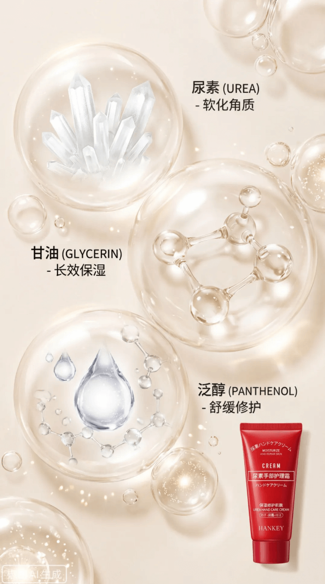 提示词:生成图中产品的电商详情页功效主视觉图,从微观视角表现产品核心成分。核心成分包括:尿素、甘油、泛醇等,以不同气泡区分展示。画面采用非对称构图,护手霜产品位于画面一侧,占画面比例较小。适用于电商详情页成分说明模块。