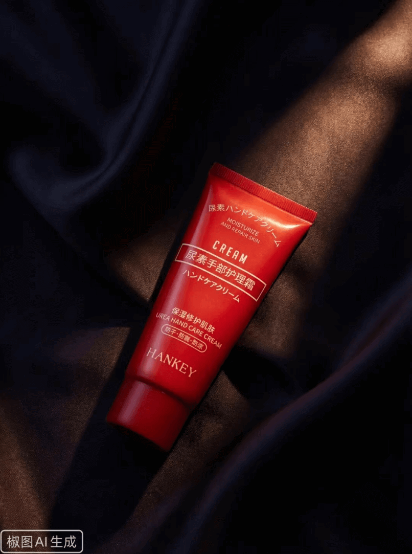 提示词:基于产品的实拍照片,生成高端护肤品电影感静物摄影,深色丝绸背景布,自然褶皱形成柔和明暗过渡,侧上方定向光源,一束光切入画面,低环境照度,大面积暗部保留,产品作为唯一视觉焦点,真实摄影质感。