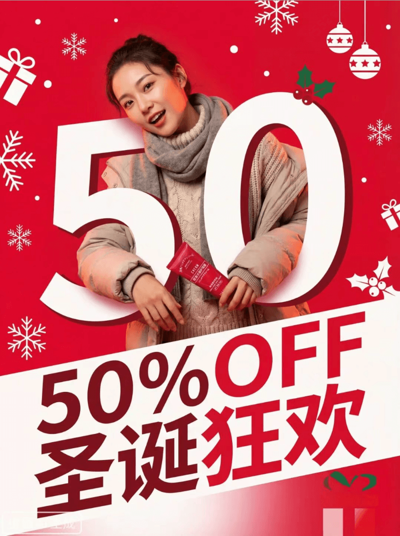 提示词:现代时尚的圣诞促销活动海报,充满活力和俏皮的能量。背景是饱和度高的节日红色,搭配圣诞雪花、礼物等图形元素,具有强烈节日氛围。一张亚洲女性充满动态、活力的高质量照片。她的时尚是现代风格的冬季服装。照片以鲜艳、全彩风格呈现,自然逼真的肤色微妙地反映出红色背景的暖色调。女人正与巨大的数字”50″进行身体互动,她的手臂穿过”0″,并倚靠在”5″上。手持图中的护手霜。页面下方文字标题”50%OFF”,副标题”圣诞狂欢”以粗体、动态且活泼的排版组合排列,使用互补的现代字体。数字和符号被视为图形元素,大小不一且相互重叠,营造出运动和兴奋的感觉。字体是干净且几何的无衬线字体。