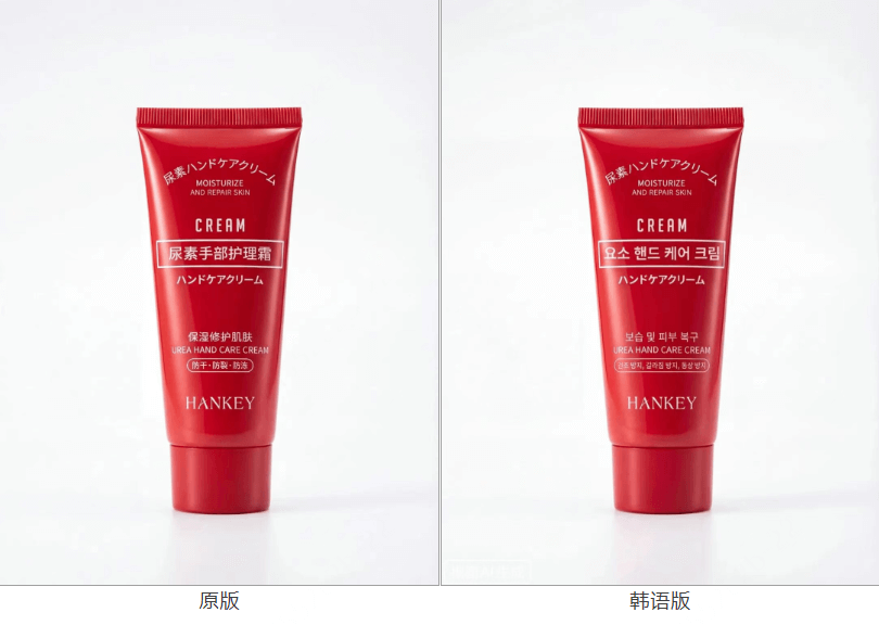 语言变化了,但是整体的排版结构都和原版一样,各种语言长度不一也能保持包装视觉的一致性,而且翻译的都比较准确,生成的文字和图片融合度很高。