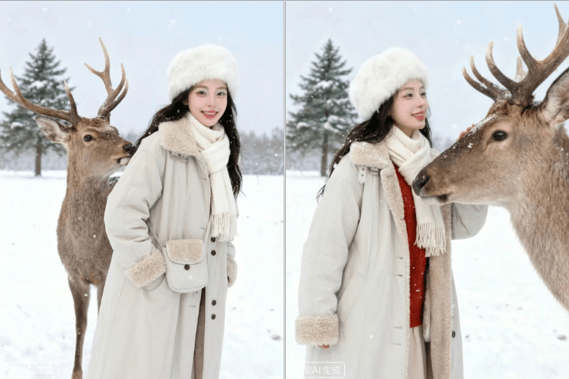提示词:将图1中女孩的外套换成图2,人物保持完全一致(面部、发型、肤色、身材、气质不改变)。在保持人物身份一致的前提下,随机生成不同拍摄角度与人物姿势,姿态自然放松,人体结构真实,比例正常,动作符合日常拍摄逻辑。光影自然协调,与环境一致,整体风格真实写实。