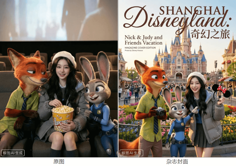 提示词:将参考图中的角色自然融入上海迪士尼乐园的真实场景中,让他们以游客的身份在园区内观光、互动与合影。画面整体以精美杂志封面风格进行布局,构图考究、层次清晰。作为一本高品质杂志或旅行相册的封面设计,重点突出人物与场景的融合感。画面需具备强视觉吸引力,色彩明快但不刺眼,人物生动自然,场景具有标志性的迪士尼元素。