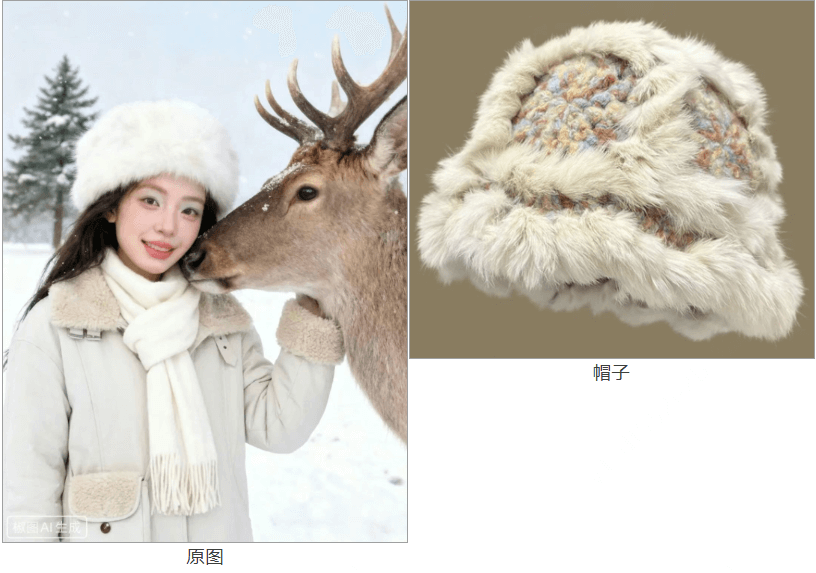 提示词:将图1中女孩的帽子换成图2,其他保持不变