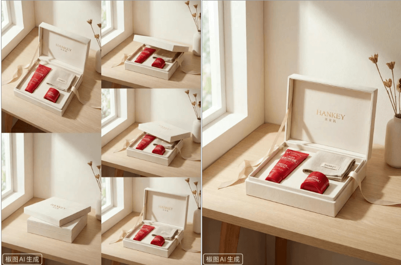 提示词:整体视觉风格保持一致,但每次生成时,礼盒的打开方式、拍摄角度、构图与元素位置会自然变化,类似同一次品牌摄影拍摄过程中按下快门得到的不同画面。