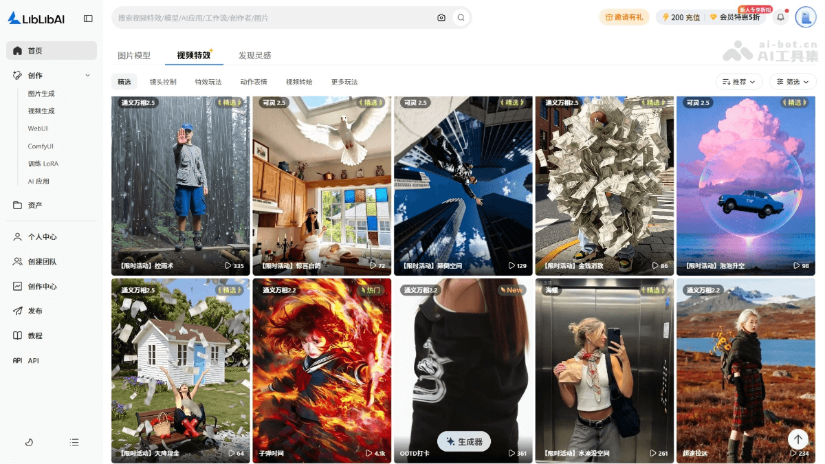 - 视频特效:LiblibAI的视频特效功能简化视频制作流程,用户能快速应用各种特效模板,如动态运镜和变形效果,提升视频的视觉吸引力。